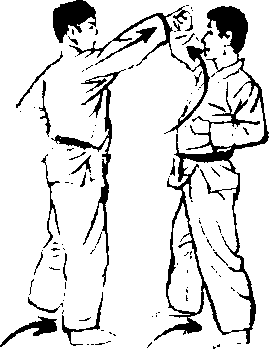 2. 〔攻手〕左三战立 之后,右脚踏前一步, 摆出右前屈立架式,朝 对方的脸孔使出上段正 拳突击。〔受手〕在对 方踏入的同时,前脚后 退一步,摆出左前屈立 架式,以上段受接住对 方的突击。