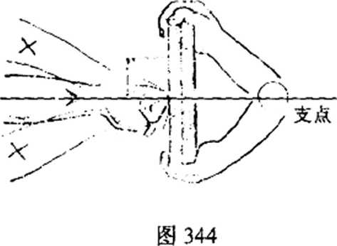 施力的路线与方向也很重要,一般对支撑物体从正面垂 直施力较斜向施力效果更佳》(图344)所以,即使功夫高超,力 道强猛,但方向欠正确,作用力也将大打折扣。斜向或横向施 力,会产生分力,物体不易击破,甚至会滑脱,不能充分发挥所 施力的作用?