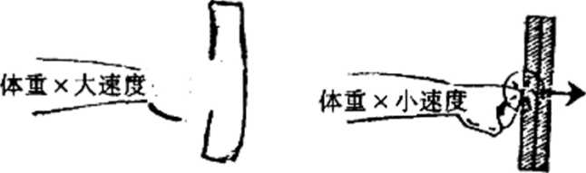 所以,体重同为78千克的两人,各用时速70公里与 100公里的速度击打物体,其冲力显然差距很大,速度快者效 果自然非凡(图345>