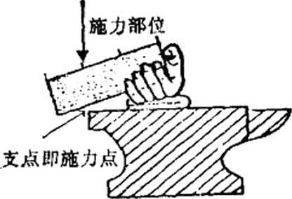 这项原理与前述内容稍有出入,并非在支点与支点之间劈 砍,而是在支点劈砍就杠杆原理而言 >这样劈不易破裂,但 下垫的砧板是具有锐角的刚体、尖锐的棱角可增大冲力的强 度,如再将砖稍稍抬起,其劈砍效果可超过支点与支点之间的 劈砍方式。