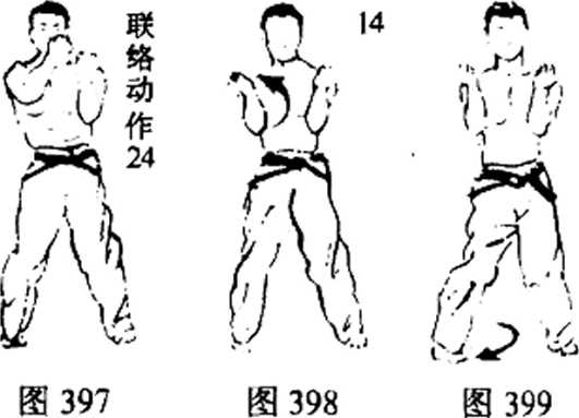 (14) 左三战立,三战的架式(图398)从13的动作到联络 动作(24)为止是吸气,14是呼气。