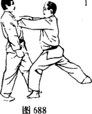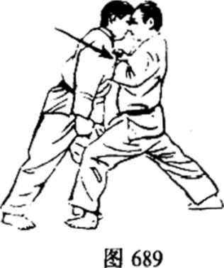 (4) 图694图695这时张开右手,抓起对方的头发,一面向拉回,一面以 左手朝对方的心窝使出下突技,打倒対方(图695)。胃