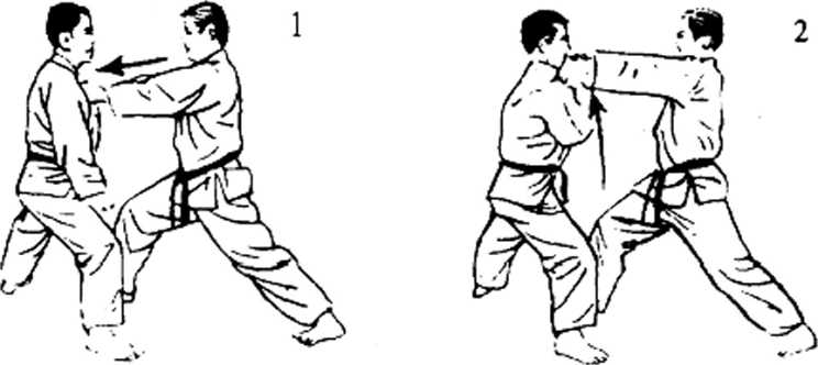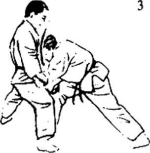 (1) 对方从后方抱住我,而另一个对手又从前而使出前踢 技时> 这时应该收回四股立的右脚,姿势抬高,以右抑跟踢向