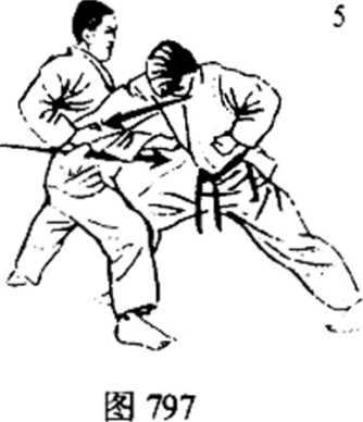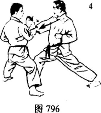 (4) 当对方挣脱出右手*以正拳突攻向心窝时,应张开 右手,手使出挂受,使对方扑空。不要正面受招,必须配合 对方突技的速度,使对方朝前方扑空。左手在腋下拉手 (图 796>,