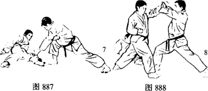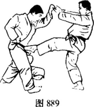 (9) 对方的突技被拮住,右脚收回退下之前,保持右前屈立 的架式,以后脚使出中段前踢技(图889)。