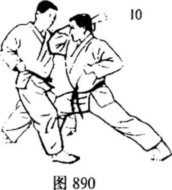 (10) 踢出的左脚放下的同时,右脚踏出,摆出前屈立的架 式,朝对方中段使出右手肘撞技(图890)。