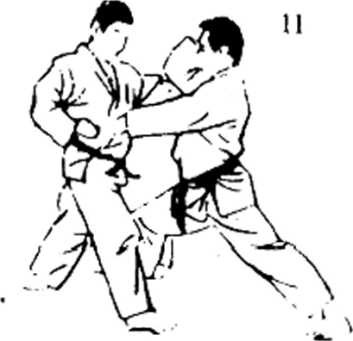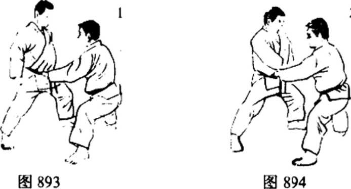 (1) 如果对方以双手抓住衣带或衣搽较低的部位,就要和 対手并立,摆出四股立的姿势(图893)。