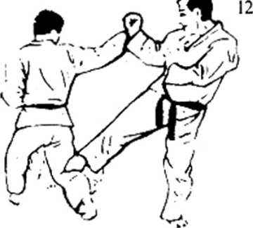 (12)左対手反击的同时,收回右脚躲开对方的突技,并抬 起右脚,对方的姿势朝侧面时,朝对方前脚右关节部位的侧 面,使出关节踢功(参照三十六手的】6?】9)(图892)。