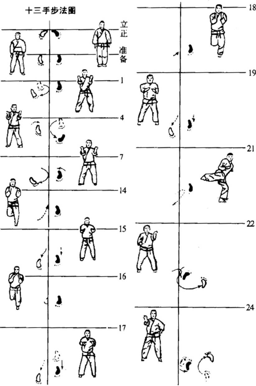 十三手和三十六手都是在十字形的演武线上展开的招式, 但在内容上,虎形”十三手的层次更高,演武线和所需要的 时间似乎比征远镇少,但在短时间内就使用五十六个招式,所 以招式种类比征远镇多出许多,允其,小招式连续动作的使用 必须顾及速度,充分利用了刚柔流独特的开手‘?挂接'