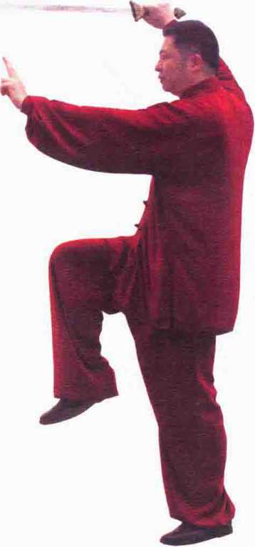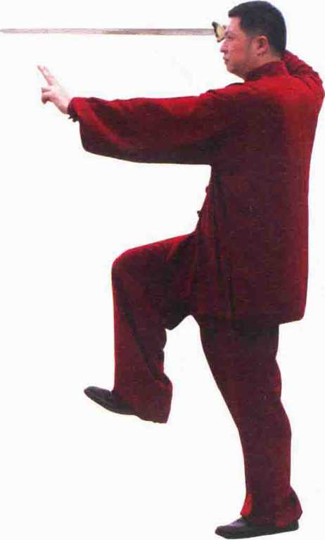 接上势,身体重心在左腿,左腿直立,脚趾抓地,右 脚提起屈膝成勾腿,脚掌向左,脚心向左前方成右斜蹬 式。同时,右手在右方向里翻腕,手心向外,虎口在里, 剑刃分上下,手臂挺直,剑尖向左方,左臂向前伸去,成 掌心向前,虎口在内,剑指自然向前式,眼向左手前视