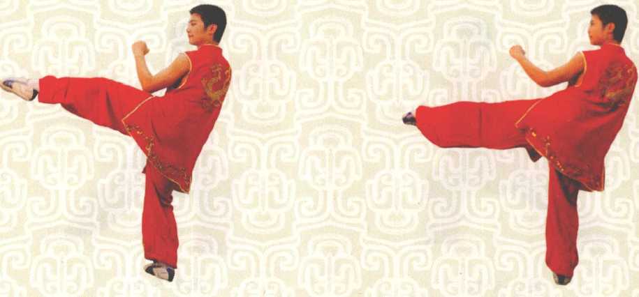 接上式右脚向前落地后身体右转左脚提膝脚尖向上用力向前向上踢出左脚在下落收回时身体右转同时左脚再用力向前下方踹出力达脚底见图2-5-15、图2-5-16。