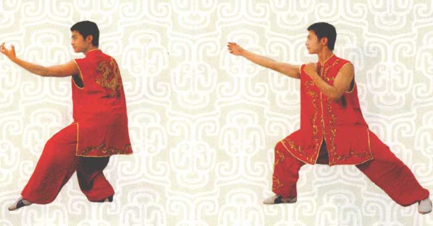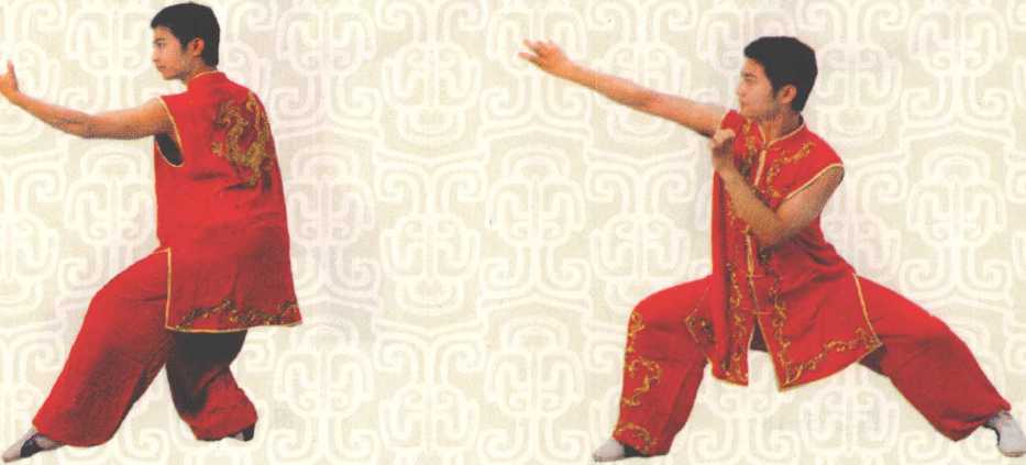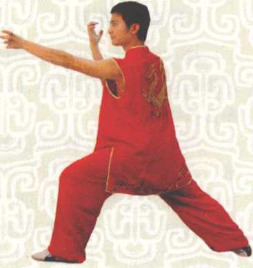呼吸意念左小臂由内向外格挡时吸气收小腹提两阴。意念腹内的真气提到胸部与吸入的天地之气汇入胸部中丹田落步成右弓步时呼气小腹鼓荡中丹田气灌达右爪指尖同时部分真气下沉入下丹田。