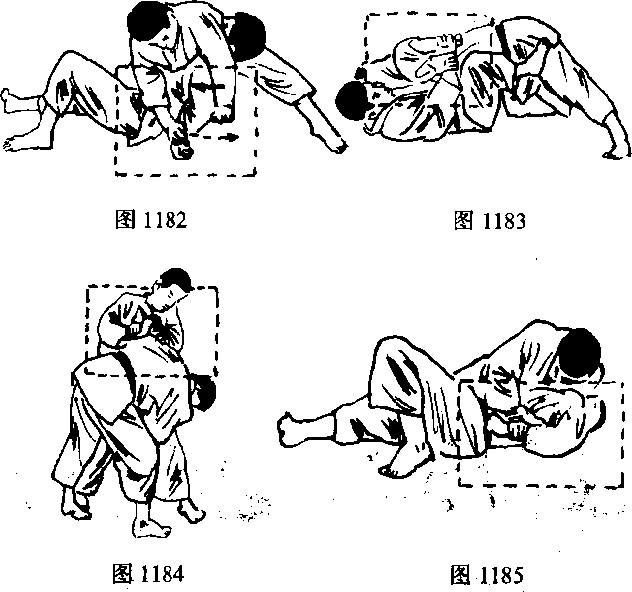 (2)右手抓住对方的左手腕,左手从对方的肩膀端绕到对方 的背后,抓住自己右手腕处。右膝盖着地将对方的背部往下推, 并且将对方的手府往相反的方向压迫。如图1182。