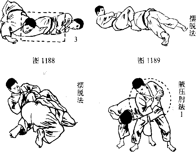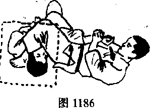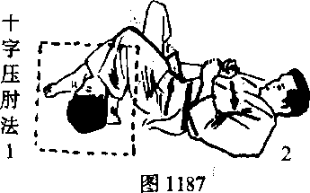 十字压肘法,就从正侧面用两腿夹住对方的一只手,再把夹住 对方的手肘关节往相反的方向压迫,控制对手.如图1186Tl88,