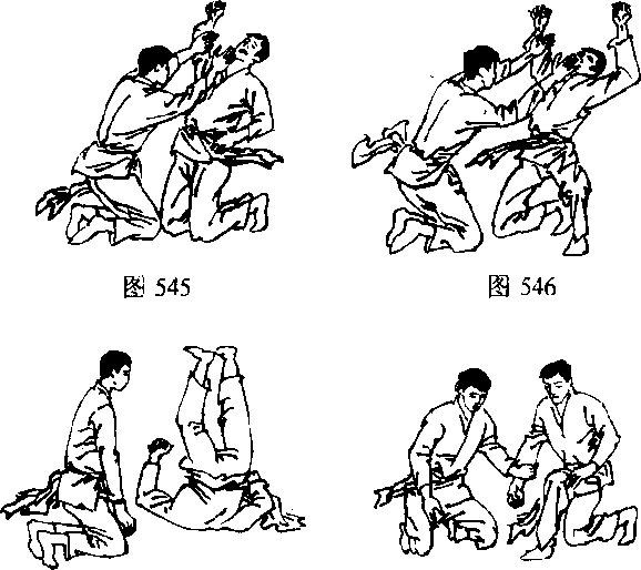 取受双方都以正坐相对。①受者右手握拳欲攻打取者; ②取者立即以左手刀将受者举起的右臂自内朝外扫开,同时用 右手掌猛推受者的下颗;③再以左膝前进;④使受者后仰而倒。 如图 544 — 547。