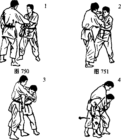 浮身摔法是以右手抱住对方的左侧腰部一带(右手要从对方的前方伸过去)。把对方的身体抱起来摔出去的技法。如图750-756。图752图752图753图753图754图754图756图7561-4图图7571-4图图757(1)对方想要采取右自然体的架式时我快速抓住其右袖。对方必急伸左手,这正是我方求之不得的好机会