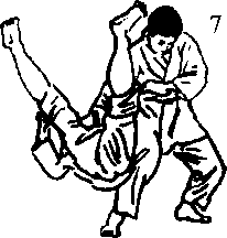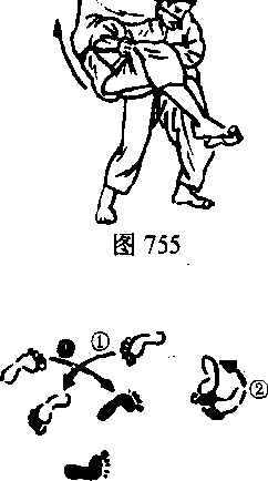 (5)两脚突然伸直腰部及下腹部挺出两手紧紧的抱着对方将其向右后方摔倒步法见图757