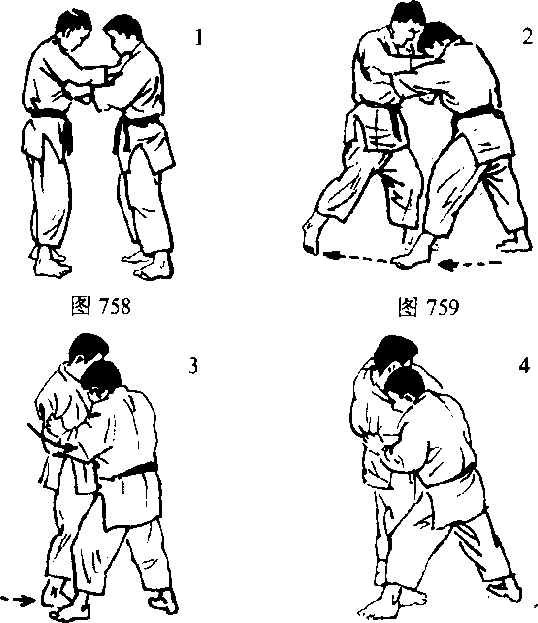 把对方往后方压迫使其失去身体平衡将其摔倒。如图758