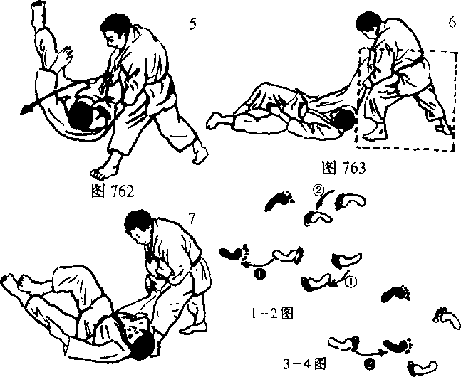 (3)对方若不踏出右脚而先踏出左脚右脚跟进时以左脚抵住对方前进的右脚尖强迫其踏出右脚来。