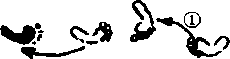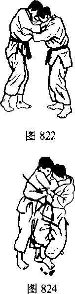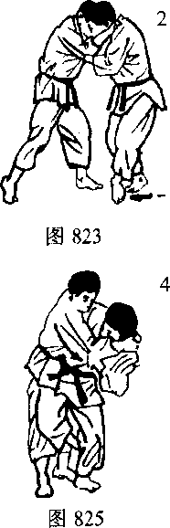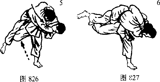 把对方前后推拉,使其失去身体平衡。接着冲进对方怀里用腰部和脚配合膝盖的弹力往侧面弹起摔倒。如图822-828图829为步法图