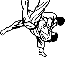(3)将重心放在左脚尖上突然伸直膝盖同时用右脚似要打击对方右膝盖般的状况下把对方弹起顺势摔出,