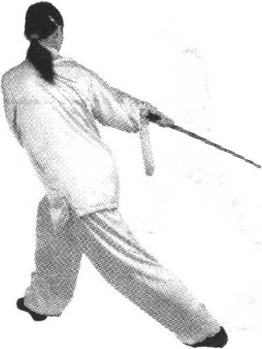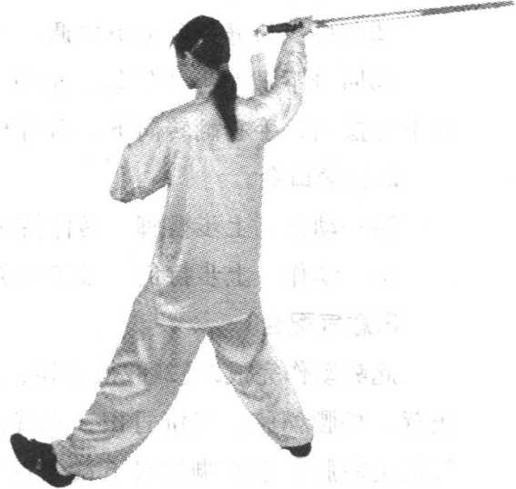 练习者可设想对方剑向我右膝部刺来,我即回带用剑刃削 格来剑。接着可设想对方向我头部刺来,我随即回带,用剑刃 前半段劈向对方头部及肩部以化解之。