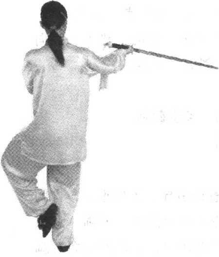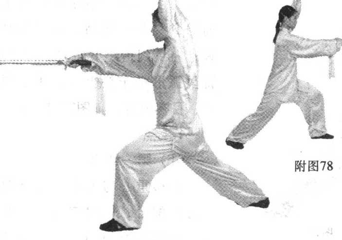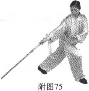 ①随重心前移,右脚摆步 向前,屈膝半蹲,左腿自然伸 直,脚跟提起,上体右转;同 时右手握剑向右后方下截;左 手剑指屈肘向下附于右肩前, 手心斜朝下;目视剑尖。(图 74?图75)