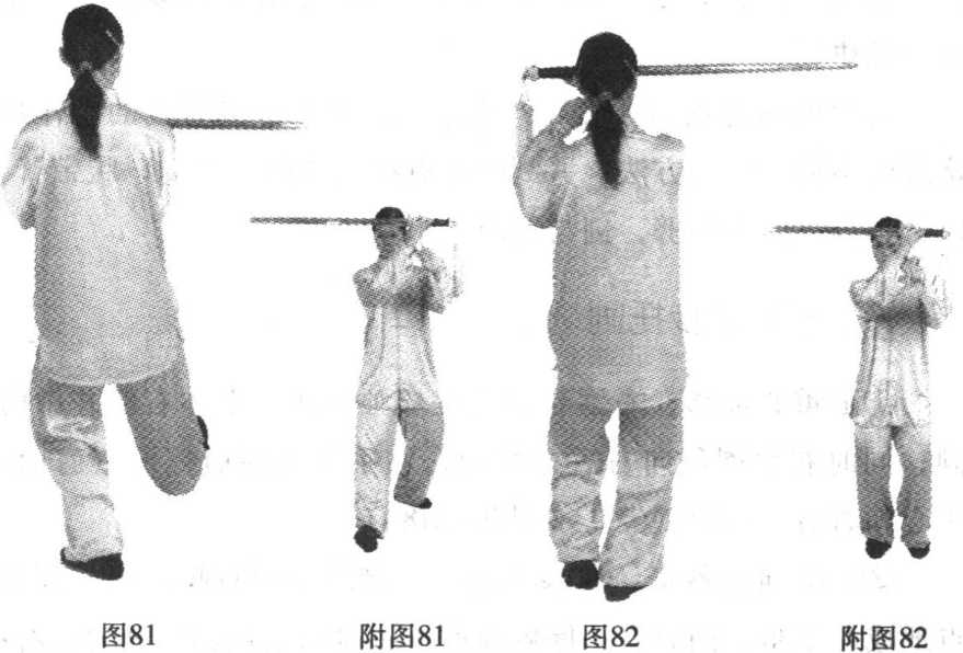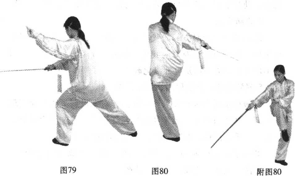 ① 随重心前移,右腿屈膝上提成独立式,上体右转并微前 倾;同时右手握剑向右后方截剑,左手剑指屈肘摆至右肩前, 手心朝右后,目视剑尖。(图79?图80)