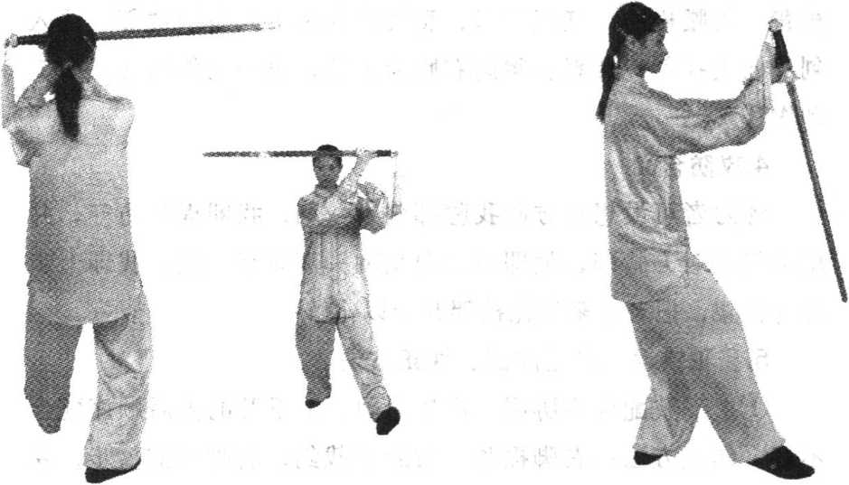 ④ 随重心前移,左脚向右脚并步,两腿屈膝半蹲,上体略 左转;同时右手握剑,剑柄领先,向上、向左划弧带至左胯旁, 手心朝内,剑尖朝左上方,左手剑指向上,在头上方与右手相