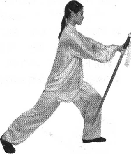 剑尖方向。(图85)③随重心前移,右腿屈剑尖方向。(图85)③随重心前移,右腿屈膝前顶成右弓步,上体略右膝前顶成右弓步,上体略右转;同时右手握剑沿右腿内侧向前穿刺,与肩同高;左手剑指 向左后方划弧摆举,与肩同高,手心朝外;目视剑尖。(图86)