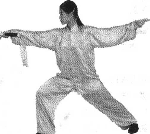 外,剑尖朝右,稍低于腕, 左手剑指仍附于右腕;目视