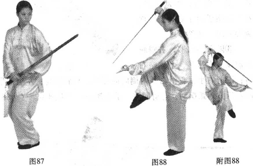 ⑤ 左腿自然伸直,右腿屈膝提起,腿尖自然下垂,上体右 转(90度);同时右手握剑使剑尖在体左侧立圆划弧至后下方 时,以剑柄领先,前臂内旋上提举至头前上方,手心朝右,剑 尖朝前下方,左手剑指外旋,向前下方伸出至右脚踝内侧前方, 手心朝前上方;目视剑尖方向。(图88),