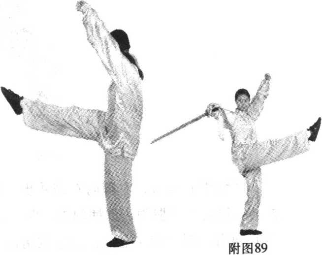 ⑥ 成分脚;同时上体略 向右拧转,随转体右 手握剑经上向右后方 点剑,腕同肩高;左 手剑指向左上方摆 举,臂呈弧形举于头 上方,手心斜朝上; 目视剑尖。(图89)
