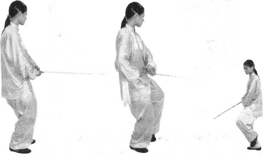 ②右脚在左脚后方震脚和左脚向前虚点地面应协调一致, 同步到位,震脚时应当发劲,右脚不要太高,劲力要下沉,左 脚要提脚跟虚点地面,只需用三分劲,身体重心在右脚,不要 弓背、塌腰、凸臀。