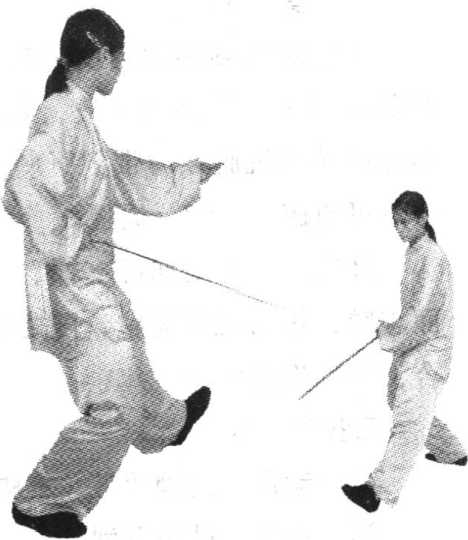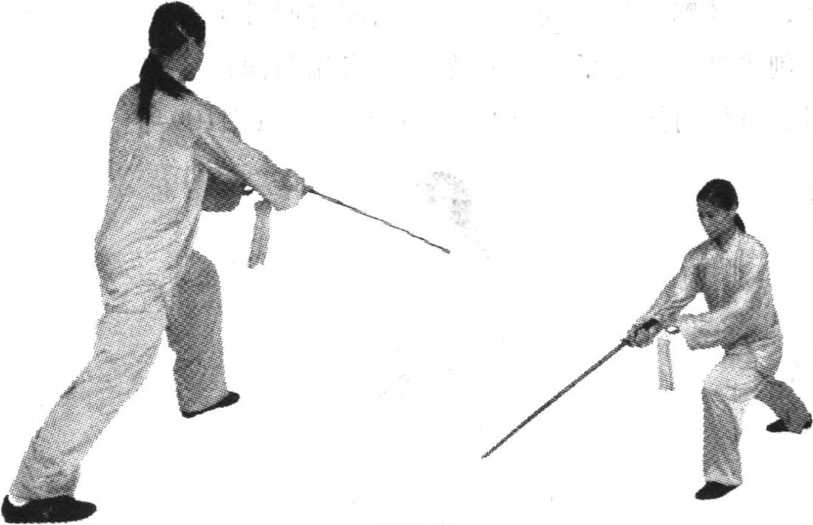 练习者可设想我用剑贴前,下刺对方膝盖。