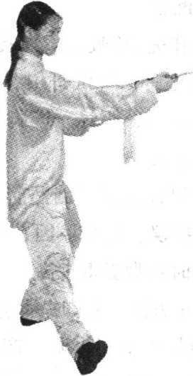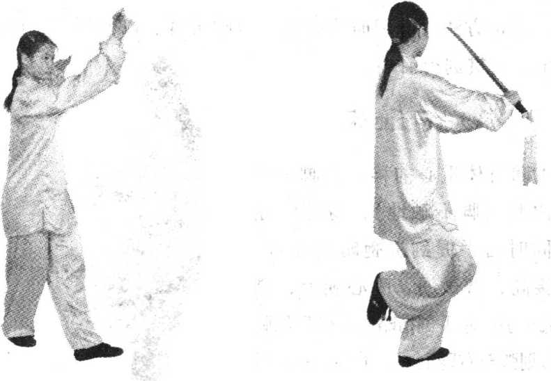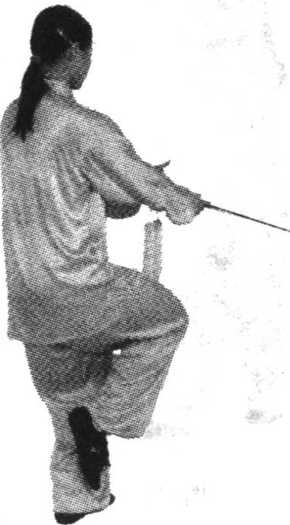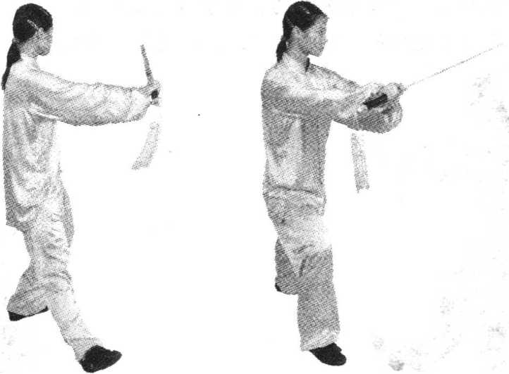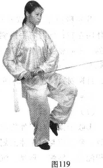 ⑤ 身体重心右移,左脚跟至 右脚内侧(脚不触地),身体略右 转;同时右手握剑略屈肘右带, 腕同腰高,剑尖朝左前;左手剑 指仍附于右腕内侧;目视剑尖方 向。(0119)