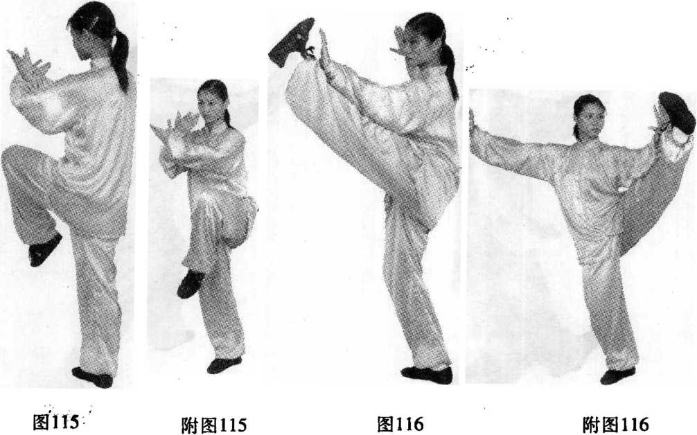 ③ 蹬脚与分掌侧举协调一致,蹬脚时要意念后手,落脚时 要呼气下沉,起腿时松身沉气,以助稳定。