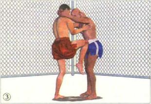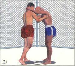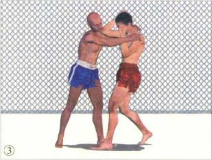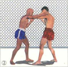 对手使用泰式缠抱控制我头颈的一个主要目的就是破坏我的身体平衡。在对手双臂尚未收紧时我先发制人抢先一步破坏对手的重心平衡。这点是非常必要的随后的反击手段可以灵活运用。