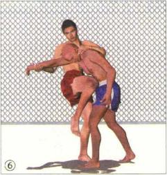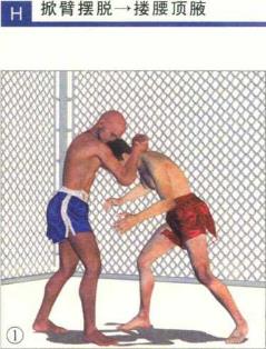 ?然后双腿屈膝下蹲身体左转左手抓着对手右臂顺势将其向自己头部后上方拖掀使头颈顺利脱离对手双手的控制移动至对手右腋外侧。同时右臂朝对手后背伸展屈肘勾搂住其左侧腰胯位置。