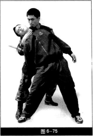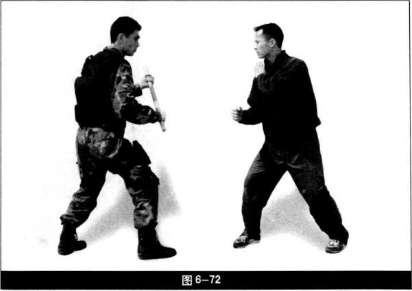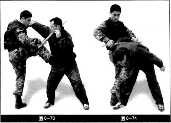 动作要领(1)我双手握警棍成格斗势敌欲向我进攻(图6-72)。(2)敌右摆拳攻击我头部我左脚垫步同时左手挡抓敌右手腕右手持警棍击打敌右颈部右脚弹踢敌裆(图6-73)。(3)右脚落步左手抓腕前推后别敌臂右手持警棍将棍端从敌右臂下前插左手虎口按住敌右腕四指接握警棍端而后右手迅速握警棍下压敌右肩右膝提膝上顶敌胸腹部(图6-74)。(4)右脚落步右小臂顶住警棍右手前伸锁住敌咽喉左脚后撤步右手回带迫使敌后仰将敌制服(图6—75)。动作要点格挡、弹踢、击颈同时完成落步后警棍穿臂快下压上顶协调警棍别住敌右臂锁喉准确。