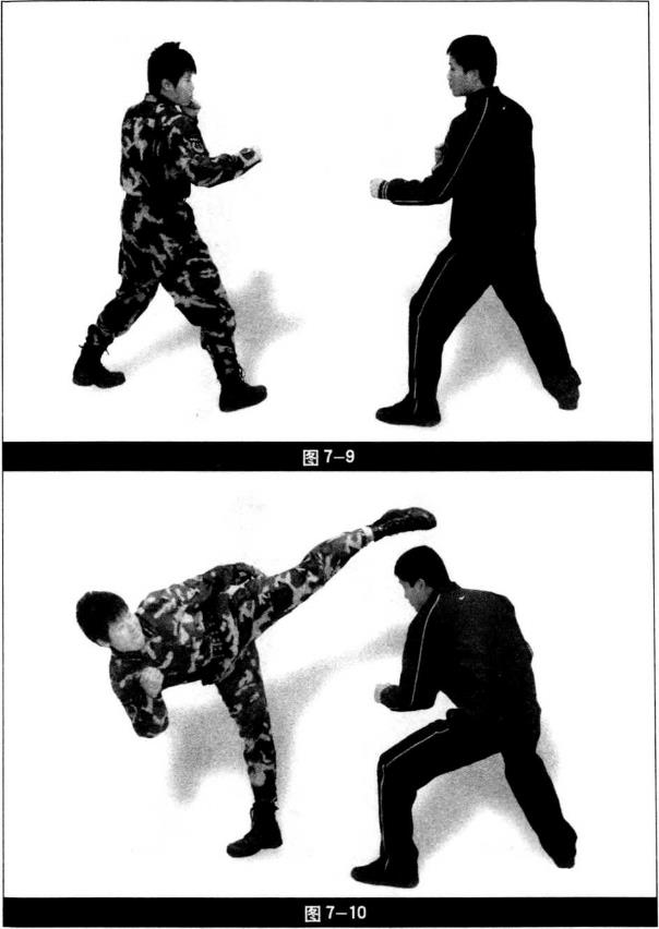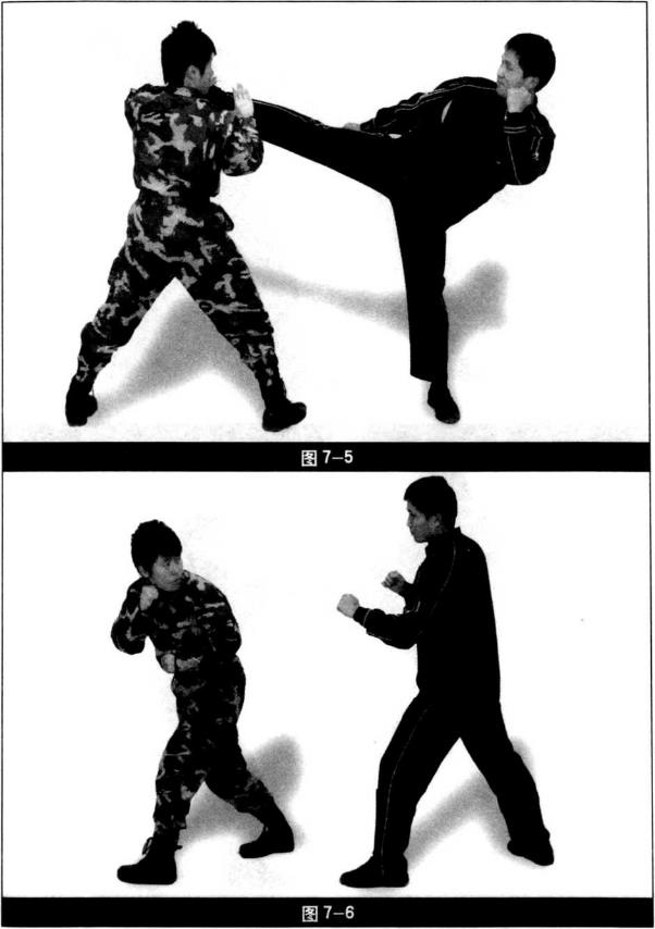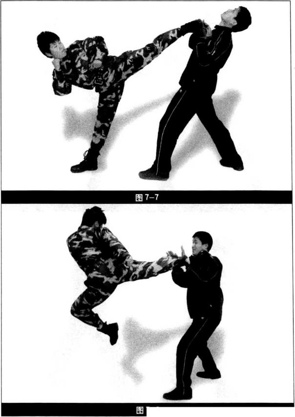 踢击我我用双手小臂进行格挡(图7-5)我快速向左转身侧向歹徒(图7-6)。3 我用后踹腿踹击歹徒胸部将其踹出(图7-7)我快速衔接旋风踢踢击歹徒(图7—8)。7-84 我踢击后快速落地面对歹徒(图7-9)快速衔接后摆腿踢击歹徒头部歹徒快速下港躲闪(图7-10)。