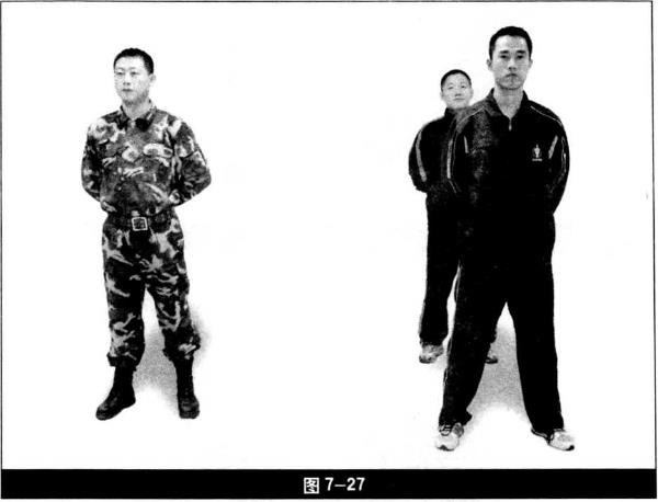 动作要领1 我与歹徒在站立的基础上(图7-27)听到开始的口令后我与歹徒成格斗姿势相对(图7-28)。
