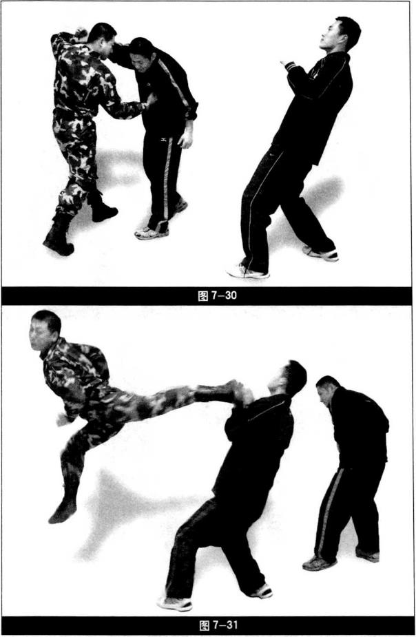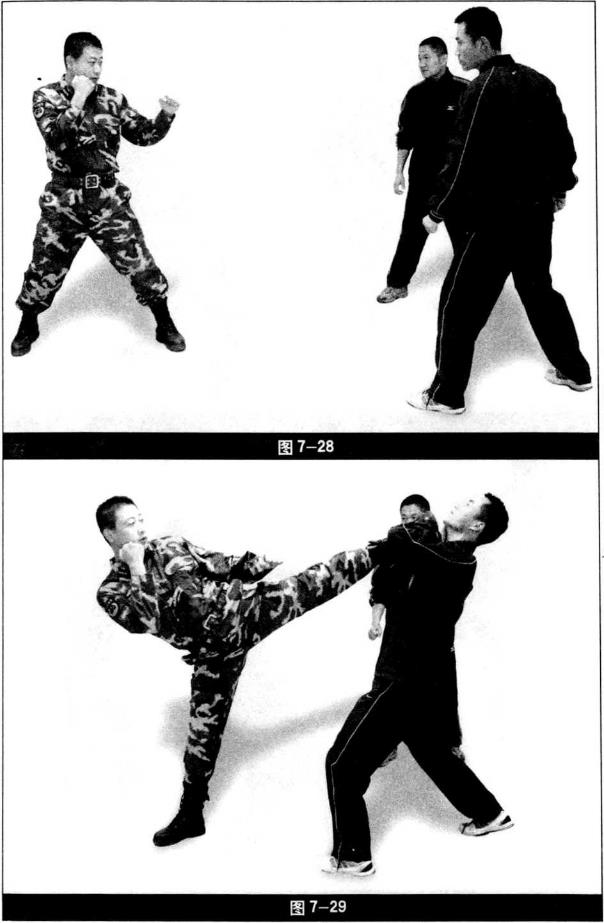 踹击头部将其踹出(图7-29)歹徒乙迅速上步用右摆拳攻击我我用左小臂格挡右勾拳攻击其腹部(图7—30)。