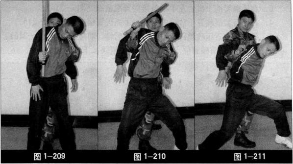 3 左手圈抱住敌左臂同时右手持警棍由敌右腋下前伸上举(图1-209、图1—210)。