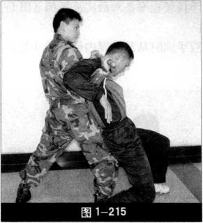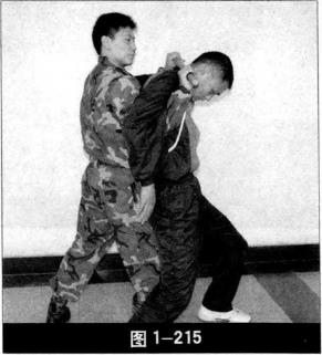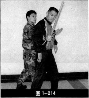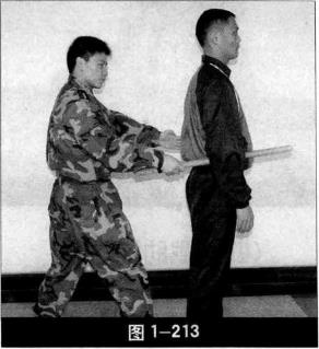 4 右手持警棍横置于敌后颈部左手抓握警棍前端(图1-215)。