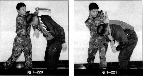 4 身体右转右手握警棍从敌后颈上方前伸左手在下准备接握警棍(图1-220)。