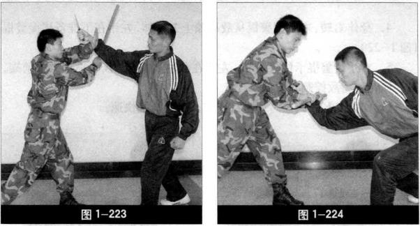 2 敌右手挥匕首向我头部斜砍我迅速上步近身左手格挡敌右小臂右手持警棍前伸至敌右小臂外侧(图1-223)