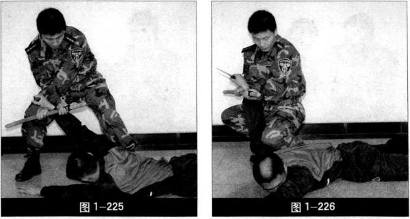 5 左膝跪压敌右肩,双手持警棍锁住敌右手腕,将敌控制(图1-226)动作要点格挡同时警棍前伸警棍锁敌手腕要快速、熟练后带下压协调。