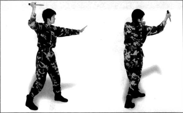 右脚向前上半步左手立掌自然向前推出右手至头上方刀尖朝前目视前方(图3-46)。左手回收至下颌右手匕首由右上方至前斜扎颈部右侧身体同时左转