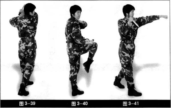 手位置不动(图3-39)。右腿提膝上抬右手匕首向右腿外侧格挡身体稍右转膝关节尽量贴近胸部目视格挡方向(图3-40)。右腿向前落步,左手直拳身体右转同时左脚蹬地拧转右臂收回至下颌刀尖朝斜下方目视前方(图3—41)。